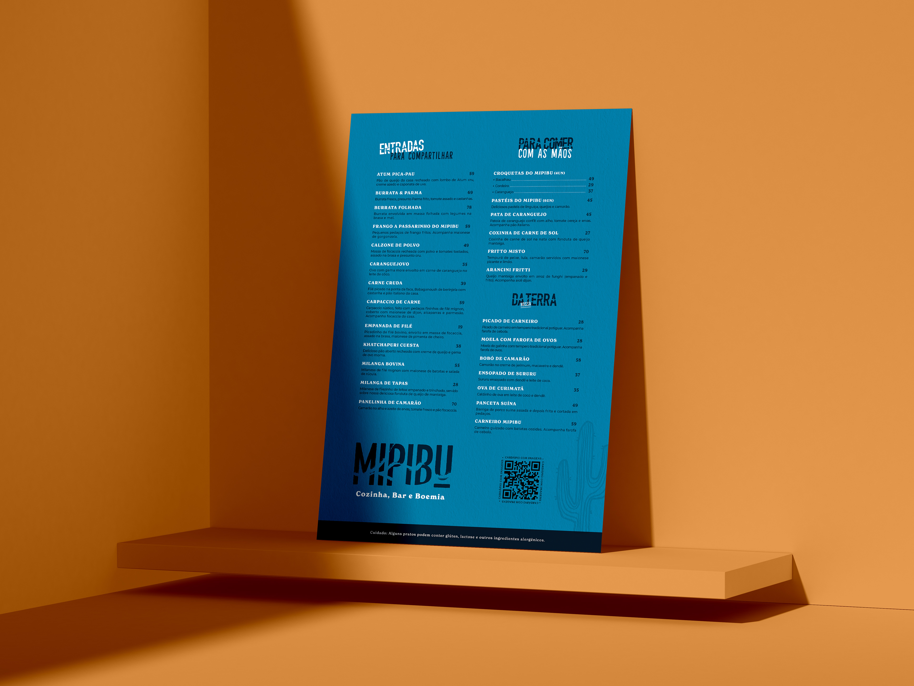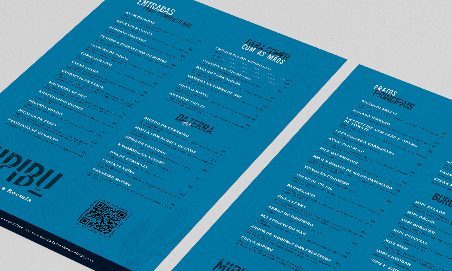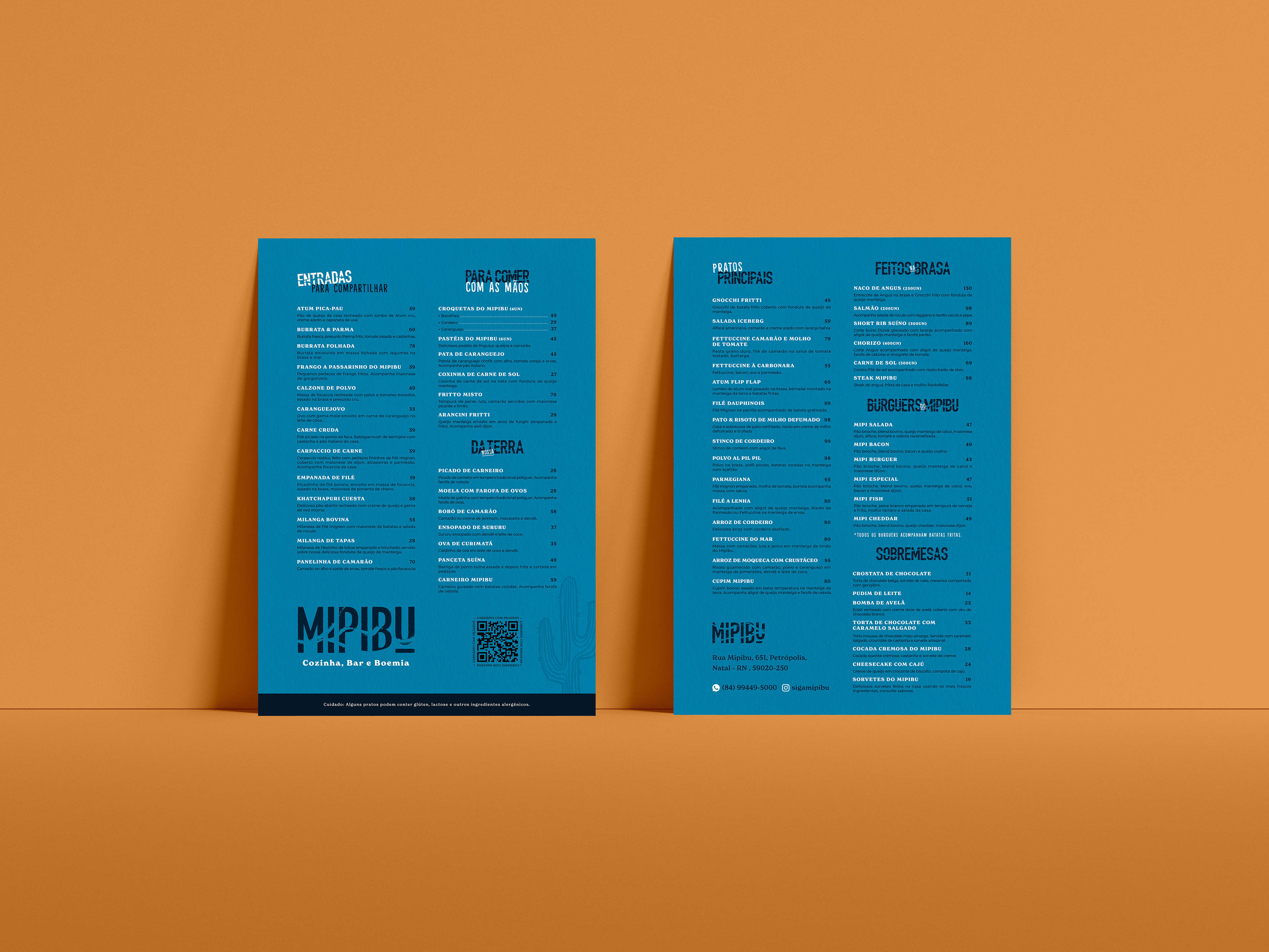(PT-BR) Este projeto apresenta o design dos cardápios do gastrobar Mipibu, desenvolvidos com uma paleta que destaca um azul vibrante como cor principal, acompanhado de um azul mais escuro e detalhes em branco para criar contraste. A proposta visual traz uma forte pegada nordestina, utilizando fontes rústicas e o ícone do cacto como elementos de identidade. Os títulos foram propositalmente trabalhados de forma desconexa e assimétrica, adicionando um toque divertido que reflete o clima boêmio, leve e descontraído do bar.